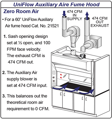 | The energy saving Auxiliary Air Fume Hood requires zero room air. This is because the auxiliary air supply is equal to the CFM exhaust of the hood - thus zero room air is required. With sash at an 1/2 open operating position and a face velocity of 100 fpm, the supply equals the exhaust; which makes up for insufficient room air availability and by not exhausting expensive existing tempered room air. |